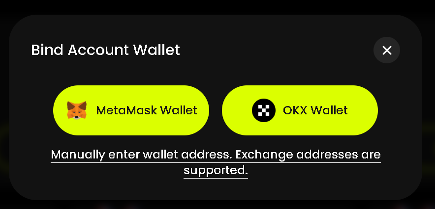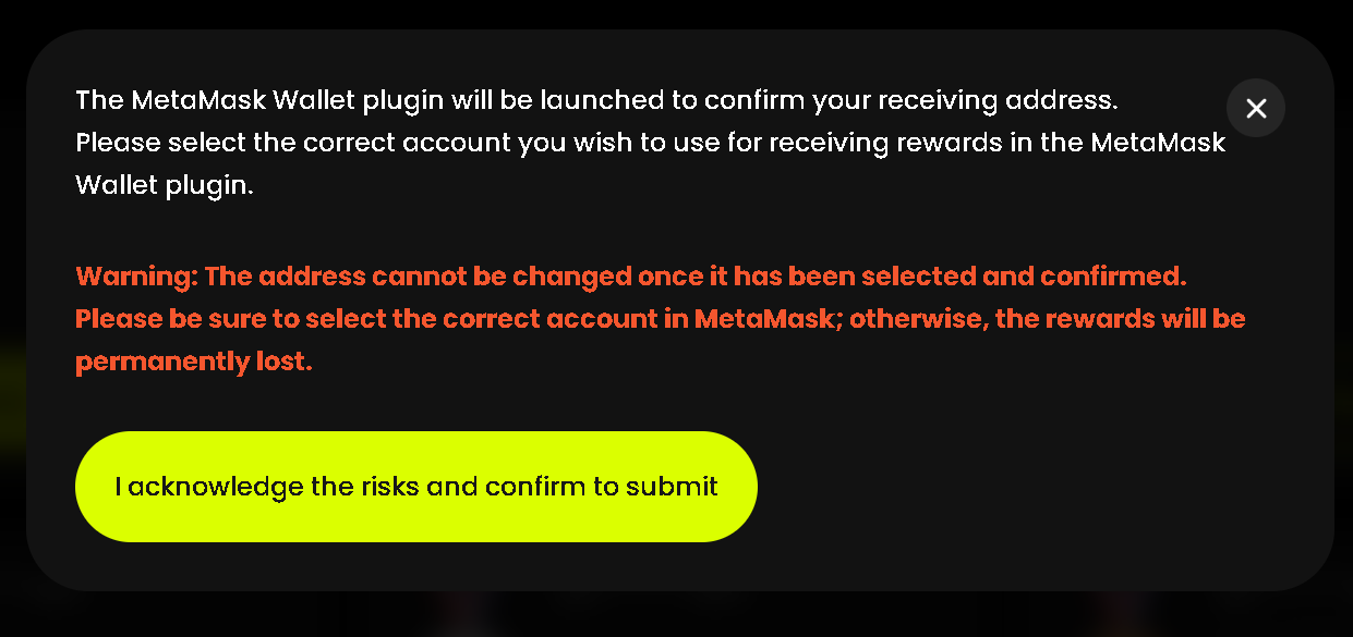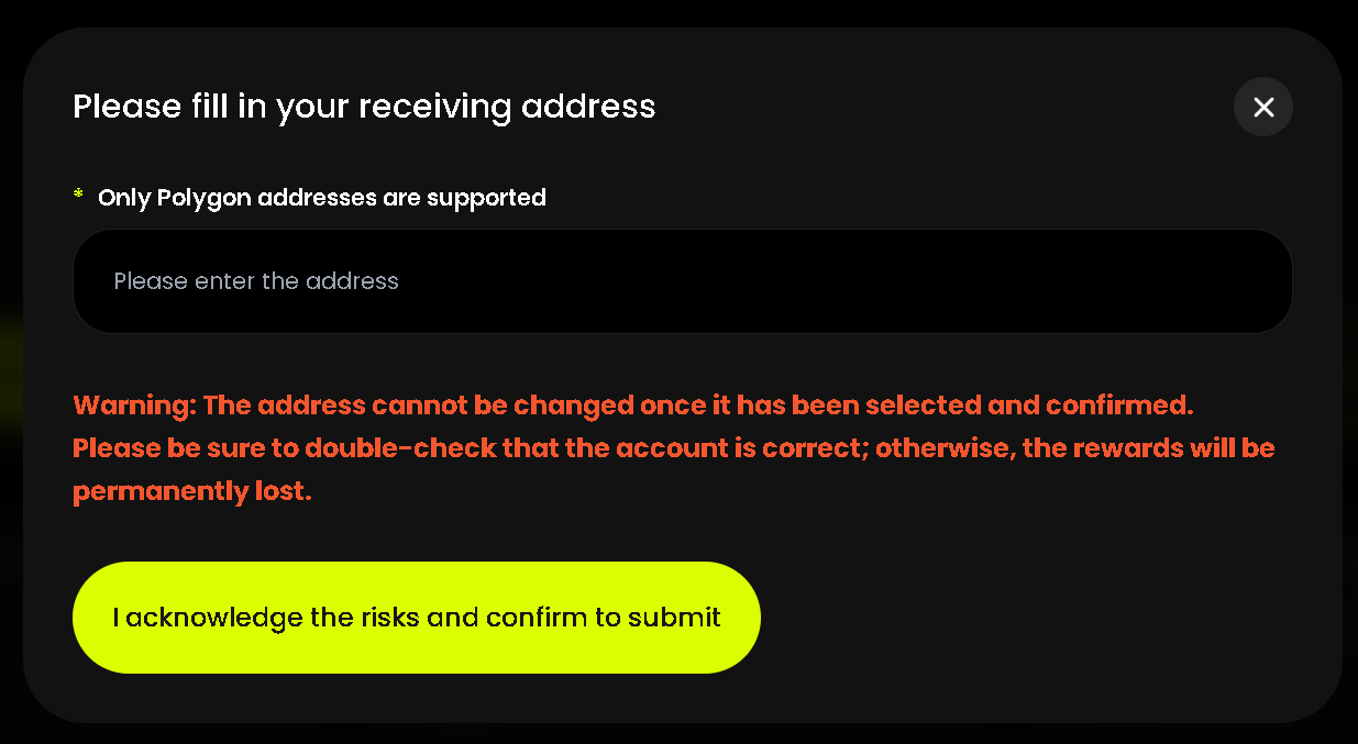 Warning: Please be extremely careful when entering an address manually. If an incorrect address is bound, the reward cannot be recovered. We strongly recommend using the copy-and-paste function instead of typing manually to avoid errors.